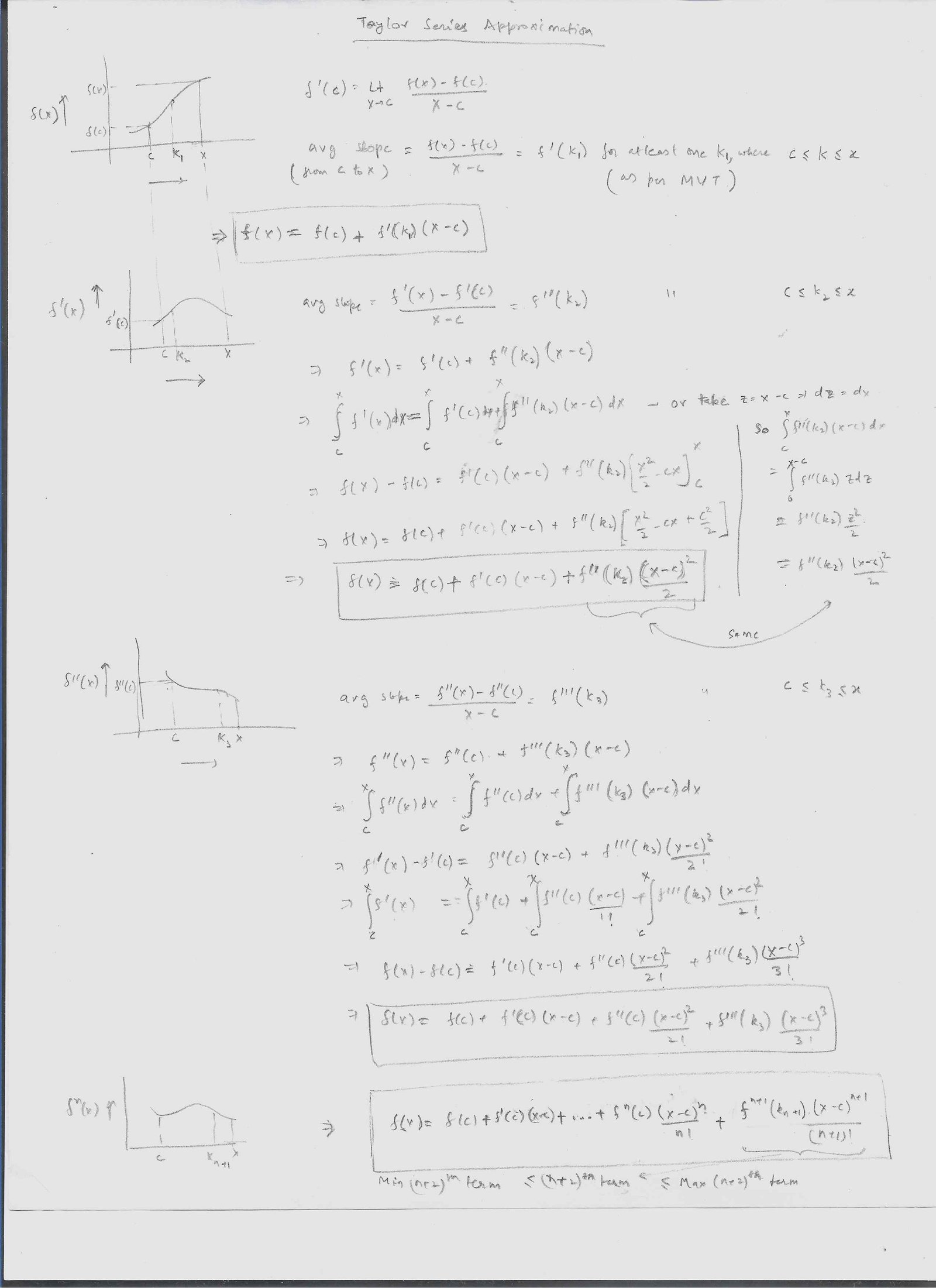 Another proof for this is by using MVT. IT's lot easier to understand and gives a more intuitive understanding of why TS even exists for any func => taylor_series_approximation.jpg
